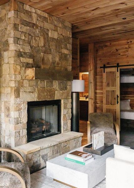 $200K PROJECTED RENTAL REVENUE! Welcome to 340 Hemlock Trail, a brand-new contemporary rustic chalet perched above the sparkling waters of Fightingtown Creek. This refined mountain retreat blends elevated modern design with timeless natural elements, creating a peaceful yet luxurious escape. Inside, the home features three spacious bedroom suites, a bunk room, and two levels of open-concept living. The main level offers soaring ceilings, a dual-sided Tennessee Field Stone fireplace, and a stunning gourmet kitchen with Cafe appliances, a commercial-grade refrigerator, gas range, Carrara marble countertops and backsplash, custom black oak cabinetry, and a full butler's pantry. A custom steel front door sets the tone for the thoughtful finishes throughout. The primary suite overlooks the creek, with a spa-like bath showcasing a vessel tub, marble walk-in shower with rain heads, and a custom walk-in closet. Outdoor living is at the heart of this home. A covered porch with a stone fireplace creates the perfect spot to unwind to the sound of flowing water. The terrace level features a large den with a fireplace, a full wet bar, two additional bedroom suites, and the bunk room. Glass doors open to a terrace porch with another fireplace, leading to a gently sloping lot, stone steps, a cozy fire pit, and a meandering path to trophy trout waters. The exterior is equally impressive with an upgraded standing seam metal roof and a detached finished garage with a warm wood interior, shake roof, and glass garage door. Located just minutes from Downtown Blue Ridge with all paved access, this home is sold fully furnished the perfect blend of modern elegance and mountain luxury.