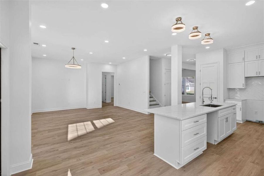 Inside, 2,742 square feet of well-designed living space delivers both warmth and function. The main level features a true guest suite with a bedroom and full bath on the first floor, ideal for visitors or flexible living. A spacious dining area comfortably seats 12+ and flows seamlessly into the chef’s kitchen, complete with white cabinetry, an oversized island, and an open sightline to the family room. It’s a layout built for real life—hosting, gathering, and everyday comfort.