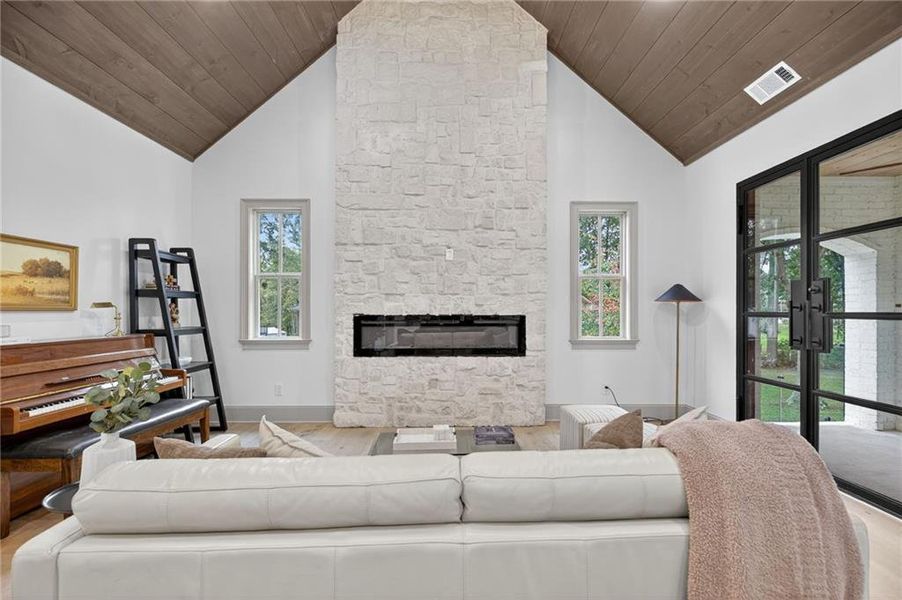 Step inside to be greeted by a lime-wash stone accent wall, making a striking impression. The beautifully engineered hardwood flooring flows throughout the home, accentuating the home's open floor plan. The open concept living space features vaulted ceilings, a secondary fireplace, and steel French doors, leading you out to the stunning porch with backyard access. The chef's kitchen is truly a culinary masterpiece, boasting high-end appliances, marble countertops, and custom cabinetry, providing ample space for all your meal prep and hosting needs. Just off the kitchen, the unique mudroom features built-out cabinetry for extra storage and convenient garage access.