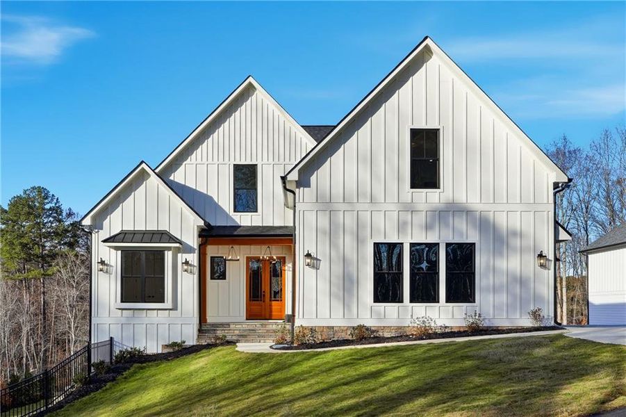 Exquisite new construction home and Seasonal Lake Views! 4BR/4BA plus Bonus room, 4,100 sq ft at 3590 Flemming Drive offers refined Lake Lanier living with seasonal lake views, wooded privacy front and back, a huge backyard, and easy lake access just steps away. Privately situated at the end of a quiet no-outlet street with NO HOA, this home features a charming exterior with board and batten and cement siding for durability and timeless curb appeal. A wide, covered front porch with double doors welcomes you into a soaring foyer featuring elegant detailing and impressive 10-foot-plus ceilings with stained beams, 8' solid doors, designer lighting, wood flooring throughout, a gas log fireplace and walls of glass doors that flood the open-concept living area with natural light. The gourmet kitchen boasts Calcutta Bella quartz countertops, quartz backsplash, farmhouse sink, pot filler, voice-controlled range hood, wine cooler, floating shelves, illuminated ceiling-height cabinetry with glass fronts with soft-close cabinetry and a hidden butler's pantry with second sink, quartz countertop and custom shelving with LED lighting. The main-level primary suite serves as a peaceful and serene retreat, highlighted by a tongue-and-groove ceiling, large glass doors providing walkout access to the covered deck, dual vanities, spa-like finishes, and a spacious walk-in closet. Also on the main level is a versatile office or guest bedroom with vaulted ceiling, featuring stained beams and upgraded crown molding. Upstairs offers a second primary suite, two additional bedrooms, two full baths, and a large bonus room perfect for a media space, playroom, or additional living area. Enjoy outdoor living on the ~500 sq ft deck with a covered porch, tongue-and-groove ceiling, and gas line for grilling or heaters. The open daylight basement features LVL beams, French doors, 8 windows, and endless potential for finishing, already stubbed for a future bathroom. Additional highlights include laundry on main, side car side garage with EV car charging port, oversized concrete driveway for boat/RV parking, high-speed internet, Tankless water heater and county water. Backs up to Corps of Engineers land with access to kayaking, canoeing, swimming, and trails. The home is fully finished, move-in ready and waiting for you! Don't miss this rare opportunity for luxury lake life. In great Location, conveniently located, it's just 5 minutes to GA 400, 5 minutes to Tidwell Park boat ramp, 13 minutes to the new Cumming City Center, 15 minutes to The Collection at Forsyth, and less than an hour from Atlanta Airport. Seasonal lake views with Lake access, no dock or permit.