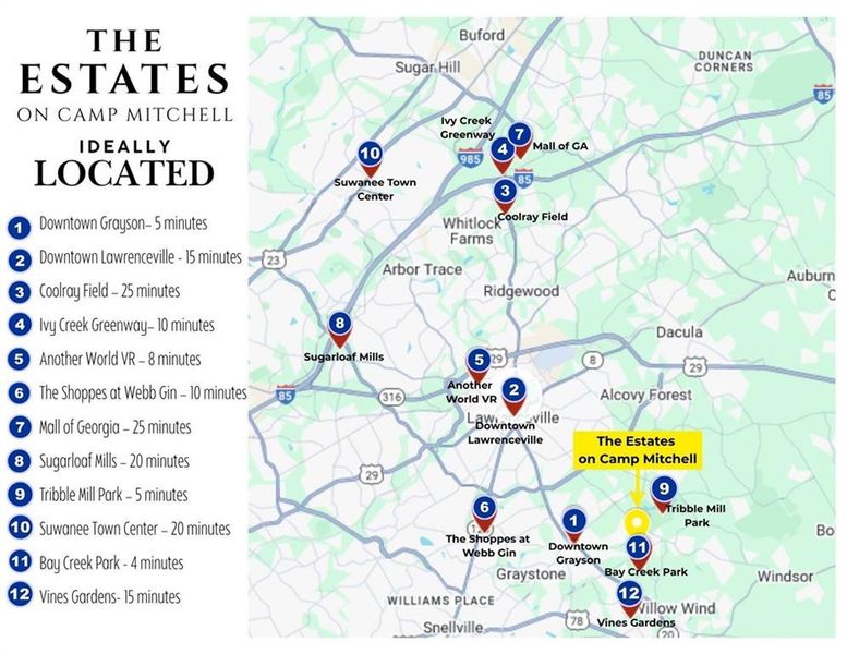 This home enjoys an ideal location in Grayson, offering the perfect balance of small-town charm and everyday convenience. Just minutes from Downtown Grayson, residents can enjoy a walkable local scene with cafés, neighborhood restaurants, and community gathering spots like Grayson Sweet Home Cafe, Guero Mex Grill, and Dante’s Pizzeria & Trattoria. Outdoor lovers will appreciate being close to Tribble Mill Park, George Pierce Park, and the scenic Ivy Creek Greenway, offering trails, fishing lakes, and wide-open green space for walking, biking, and relaxing. Ideally located near Braselton Highway, Sugarloaf Parkway, and I-85, the home provides easy access to Atlanta and surrounding areas, along with premier shopping and dining at The Shoppes at Webb Gin and the Mall of Georgia. With nearby Downtown Lawrenceville, Suwanee Town Center, and Downtown Duluth offering festivals, parks, and year-round community events, plus access to top-rated Gwinnett County schools, this location delivers a lifestyle that blends convenience, recreation, and community in one of the area’s most desirable settings.