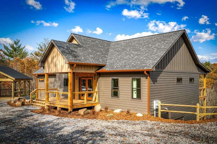 This exceptional new-construction retreat elevates modern mountain living, perfectly situated to capture sweeping pastoral and long-range mountain views. Set in a serene and private location, the home features an open, well-designed floor plan that blends comfort, style, and functionality. The main level offers refined living with two bedrooms and two full baths, including a beautifully finished primary suite with a spacious walk-in closet and a spa-inspired bath. The expansive great room showcases upgraded stainless steel appliances, luxury vinyl plank flooring, Corian countertops, and custom wood cabinetry-with a hidden walk-in pantry adding a thoughtful touch. The kitchen and dining area flow seamlessly into the living room, highlighted by a dramatic floor-to-ceiling stone fireplace that exudes rustic elegance. A split-bedroom layout ensures privacy for guests. The lower level enhances the home's versatility with a generous bonus room perfect for a second family space, recreation area, or media lounge, along with two additional bedrooms and a full bath to comfortably accommodate visitors. Covered decks on both levels extend the living space outdoors, offering ideal areas for gatherings or quiet moments surrounded by natural beauty. A two-car carport provides ample parking, while an upgraded landscaping package further elevates the property's appeal. Convenient proximity to shopping and dining in Blue Ridge and Murphy, NC, along with easy access to the nearby casino, ensures both comfort and entertainment are close at hand. Low-maintenance exterior siding and a 1-year builder's warranty complete this package!