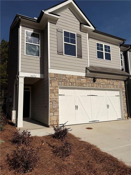 Welcome to 6672 Parsons Street at Waypoint, the hottest new community in Flowery Branch, GA. Conveniently located near I-985, Lake Lanier Island Resort, Chateau Elan Winery, and Mall of Ga. The Sudbury is a two-story plan featuring 3 bedrooms and 2.5 bathrooms with a 2-car garage. As you step into the home, a long foyer welcomes you and leads into the open-concept main living area. The large family room is the perfect place for family and friends to gather. The family room flows into the well-appointed kitchen with a center island, quartz countertops, subway tile backsplash, white shaker-style cabinetry, and stainless-steel appliances. A dining area directly off the kitchen provides space for a dining table and opens onto the back deck or patio. There is also a half bathroom tucked away on the first floor. Up the stairs you'll turn from the landing into the primary suite. This spacious bedroom is complimented by the en suite bathroom featuring a separate tub and shower, dual vanity, water closet, linen closet, and a roomy walk-in closet. Across the landing you'll be led into a loft area that's perfect for a game room or second living space. 2 secondary bedrooms, the laundry room, and an additional bathroom, also with dual vanity, round out the upper floor. Schedule an appointment to tour this today and make 6664 Parsons Street your home!