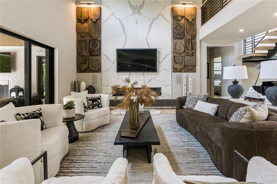 Outside, the residence transforms into a private resort with an ultra-luxury pool featuring waterfalls, water bubblers, and multiple firepits that create dramatic ambiance day and night. Expansive hardscape and lounge areas allow for seamless flow between sunbathing, dining, and evening gatherings under the stars.