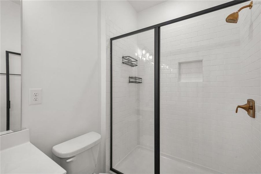Upstairs, all three bedrooms are generously sized, including a light-filled primary suite with a frameless glass walk-in shower, dual vanities, and a walk-in closet. Finishes throughout the home include clean-lined lighting, iron railings, and durable plank flooring that complements a modern lifestyle.