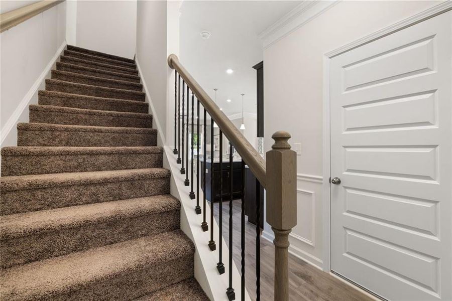 An open iron rail staircase leads Upstairs, to a versatile loft that offers flexibility as a home office, playroom, or fitness space. The private primary suite is tucked away at the rear of the home and showcases a tray ceiling, spa-like bath with a separate tiled shower and garden tub, and a large walk-in closet. Two additional bedrooms and a full bath are located at the front of the home. The laundry room is conveniently placed on the second floor.