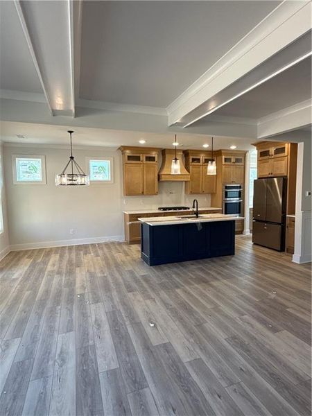 This home features a spacious open-concept floor plan, where the living room with a decorative electric fireplace flows seamlessly into the breakfast sitting area and chef’s kitchen. The kitchen is beautifully appointed with quartz countertops, pendant lighting over the island, a custom vent hood, ceiling-height cabinetry with soft-close drawers, and a stainless steel appliance package, including a 5-burner gas cooktop with pot filler, wall oven and microwave.