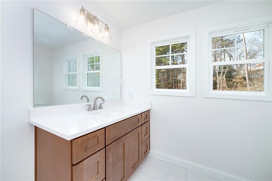 The oversized owner’s suite serves as a private retreat, highlighted by a large walk-in shower with frameless glass and spa-like finishes. Upstairs, you’ll find spacious secondary bedrooms, including one bedroom with its own en suite bathroom, ideal for guests, teens, or multi-generational living.