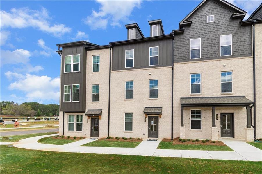 The Landon Plan by DRB Homes – This beautiful townhome offers 3 Bedrooms, 2.5 Baths, and a 2-car rear entry garage with convenient access through both the main entry and garage, ensuring added security and protection from the elements. The split bedroom layout offers privacy, with the spacious Owner's Suite featuring dual vanity sinks, a separate shower, and a walk-in closet.