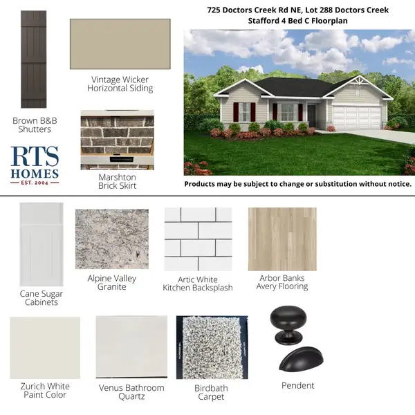 This Stafford located in the peaceful countryside of Doctor's Creek is loaded with curb appeal and always catches the eye- boasting a BRICK FRONT with low-maintenance vinyl accents. It also offers plenty of storage and flexibility, making it ideal for any sized family. The open-concept plan features clear sight lines from both the kitchen and breakfast area- the bright paint and shaker cabinets in the kitchen and bathrooms provide a fresh fresh and modern design. The primary suite has a huge walk-in closet, plus a private bath with garden tub, and separate shower. Artistic renderings are for informational purposes only. Actual floor plans, features, and inclusions may vary.