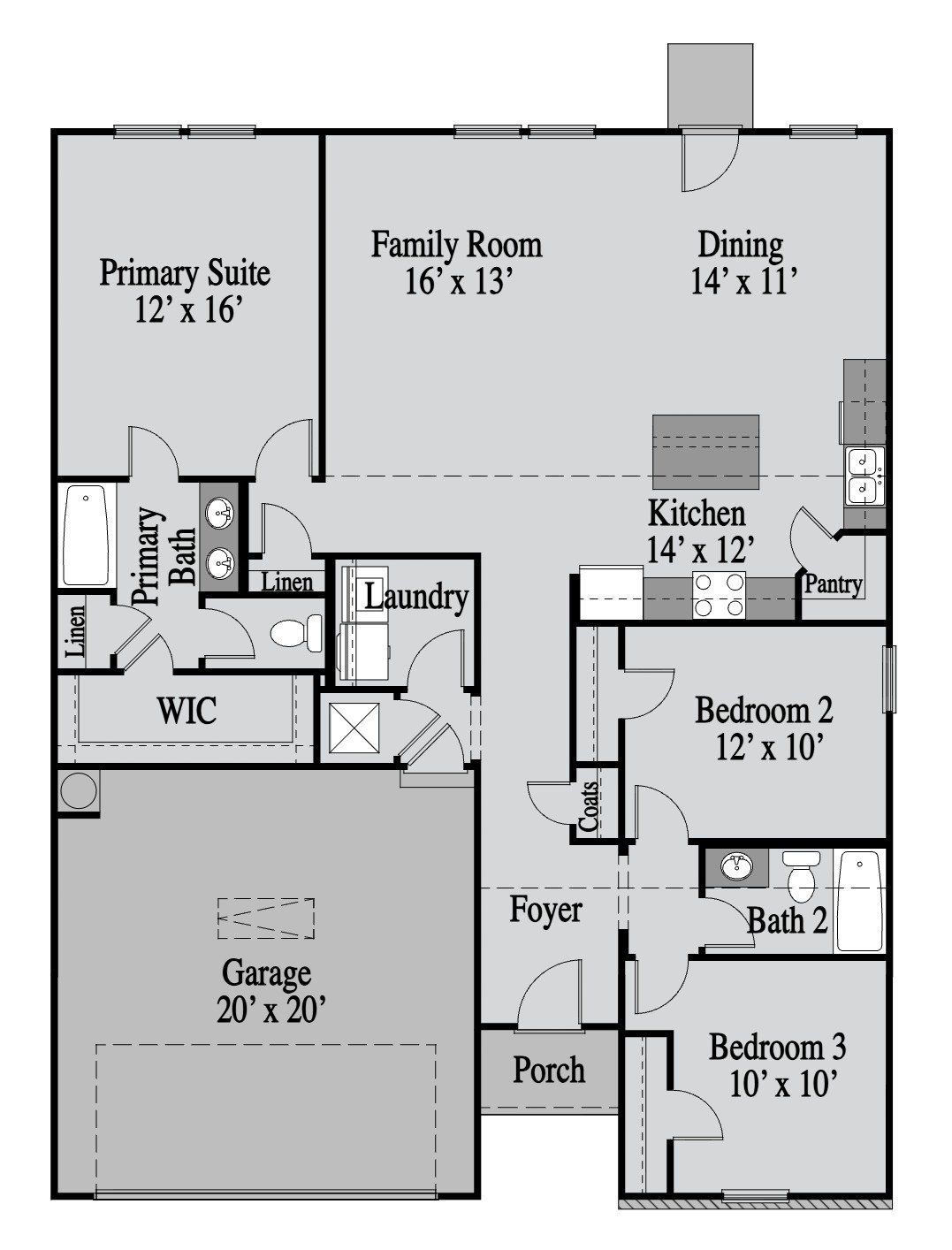“The Athens is a thoughtfully designed single-story home offering 4 bedrooms and 2 bathrooms in a modern, open-concept layout. At the heart of the home, a spacious kitchen with a center island flows seamlessly into the dining area and family room, creating the perfect space for entertaining or everyday living. The private owner’s suite features a large walk-in closet and a luxurious en-suite bathroom. Three secondary bedrooms are positioned for privacy and share a full bathroom. Additional features include a covered front porch, a convenient laundry room, and multiple linen closets for extra storage. With its smart layout and airy design, the Athens is ideal for families seeking both comfort and functionality in a single-level home.“