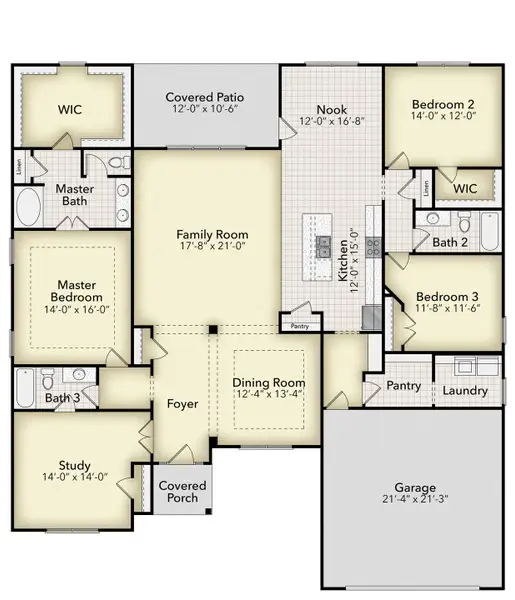 The foyer truly makes an entrance, it is big enough for a large buffet and more. The Family room is open to the kitchen with an island and lots of cabinets. Spacious separate dining for family dinners. The large owner's suite is located on the main level. It has double vanity, separate tub/shower, a true walk-in closet and it's all positioned privately on the opposite side of the house from two secondary bedrooms and a full bath. The large laundry room with linen closet is strategically located near the garage. A Must See and a Must Have!!