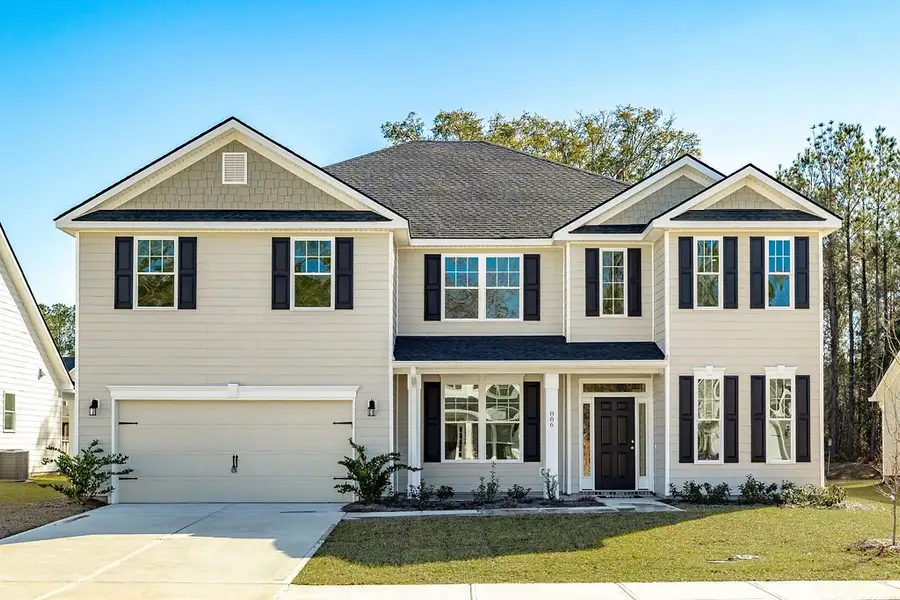 The Gwinnett plan by Smith Family Homes is under construction in NorthShore on the St. Marys River with an estimated completion date of April 2026. This 4,161 square foot home sits on a beautiful 1.35 acre lot that backs up to a lagoon and features a 3-car garage. The front door of this home opens up to a two-story foyer and beautiful double staircase. Off the foyer, sits a formal dining room on one side and an office/flex space on the other side. The kitchen is open to the great room and breakfast area and includes double ovens, a gas cooktop, quartz countertops, and a walk-in pantry. Off the breakfast area is a screened in covered back porch. There is a secondary bedroom with full bathroom on the first floor that is perfect for guests or multi-generational living. Upstairs is a spacious primary suite that includes two walk-in closets, a sitting area, a walk-in shower, soaking tub, and dual sinks. Three additional bedrooms are located upstairs that share a full bathroom. Included are LVP throughout the common areas and bedrooms, wood treads on the stairs, stainless-steel appliances (dishwasher, microwave, ovens, and cooktop), and granite/quartz countertops. Stock photos shown; to be similar but not identical.