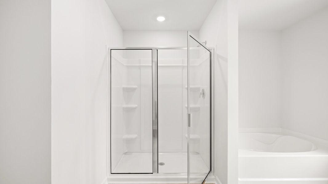As you step through the front door, a foyer welcomes you passed a flex space – perfect for a formal dining room or a home office – and powder room into the open living space. The spacious great room opens seamlessly into the kitchen. A large island is home to the sink and dishwasher and allows for countertop seating for casual eating. Stainless-steel appliances and shaker-style cabinets make this kitchen visually appealing, and the large corner pantry provides ample storage.