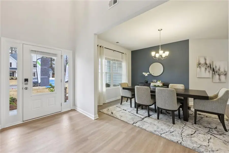 5 bedrooms, 4 bathrooms, and a 2-garage. Thoughtfully designed with stylish details and energy-efficient LED lighting throughout and with a gas and electric system. Step into a grand two-story foyer leading to a formal living room/office space, a separate dining room, and a bright two-story family room with bay windows and a cozy gas starter fireplace. The open-concept kitchen boasts granite countertops, LG stainless steel appliances, an extended island, a walk-in pantry, and abundant of white cabinet space and natural lighting. Guest quarters with a full bath is conveniently located on the main level. Upstairs, enjoy the catwalk overlooking the family room, spacious secondary bedrooms with a Jack-and-Jill bath, and a luxurious Owner’s suite featuring a spa-like bathroom with a tiled tub surround and glass-enclosed tile shower. with a huge walk-in closet. The laundry room is on the upper level for added convenience. Builder & Lender Incentives up to $25,000! 100% financing options, low fixed rates, and more! Located in Loganville, just 45 minutes from Athens and Atlanta, near top universities and technical colleges. | Stock Photos Used. The Dover floor plan.