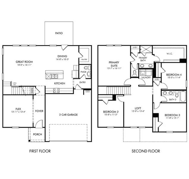 Entertaining comes easy in the Brentwood's open-concept kitchen and great room. A first-floor flex space makes a useful work area. Upstairs, the luxurious primary suite is ideal for relaxing while the spacious loft is perfect for your own media center.