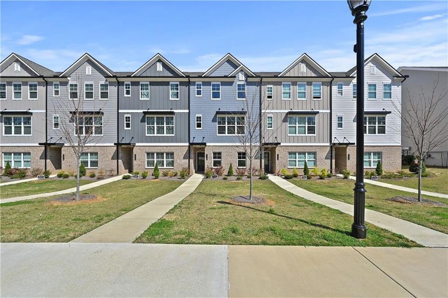 Welcome to this beautiful, like-new, 4-bedroom, 3.5-bath, brick front, 3-story townhome in the Hillcrest Landing Community. Convenient rear entry through the two-car garage leads to the terrace level, featuring a private bedroom and full bathroom, perfect for guests, multi-generational living, home office, or media space. The main living level (second floor) offers a bright, open-concept where the kitchen and family room flow seamlessly together. Kitchen with a large center island, stone counters, white cabinets, vent hood, stainless steel appliances. Premium Revwood laminated wood flooring. A private deck off the kitchen provides seamless indoor-outdoor living, ideal for morning coffee or unwinding at the end of the day. The third level is dedicated to a luxurious master suite, along with two spacious secondary bedrooms/baths, and a conveniently located laundry room. Close to top-rated schools, downtown Sugar Hill with local restaurants, boutiques, walking trails, and entertainment at the Sugar Hill bowl and the Eagle theater, plus the E Center, a fabulous athletic center. Easy access to highways 985 and 400, and just minutes to the Mall of Georgia. This home offers both convenience and lifestyle. Schedule your showing today!!