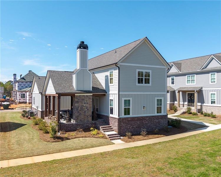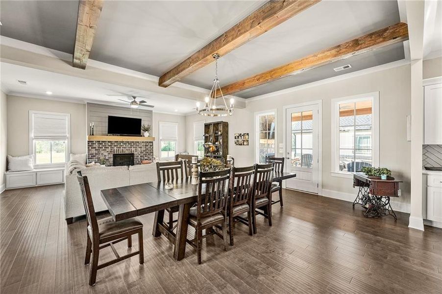 Why wait on new construction when you can move right into a beautifully crafted, already-completed home?! Enjoy one of the home’s most unique features—unmatched privacy behind the property, with green space that will not be built on, offering peaceful, uninterrupted views! This stunning 2024-built property blends modern comfort with timeless design, featuring charming board-and-batten accents, brick detailing, and inviting curb appeal. Inside, you’ll find an open-concept layout filled with natural light, a designer kitchen with a large island, and seamless flow into the living and dining areas—perfect for everyday living and entertaining. The living room showcases warm wood beams and a cozy fireplace, creating a welcoming gathering space. The primary suite offers a spa-like retreat with a freestanding soaking tub, oversized tiled shower, and elegant finishes. Private office space or playroom beside the kitchen! Step outside to a covered back patio with a wood-paneled ceiling and outdoor fireplace, ideal for year-round enjoyment.