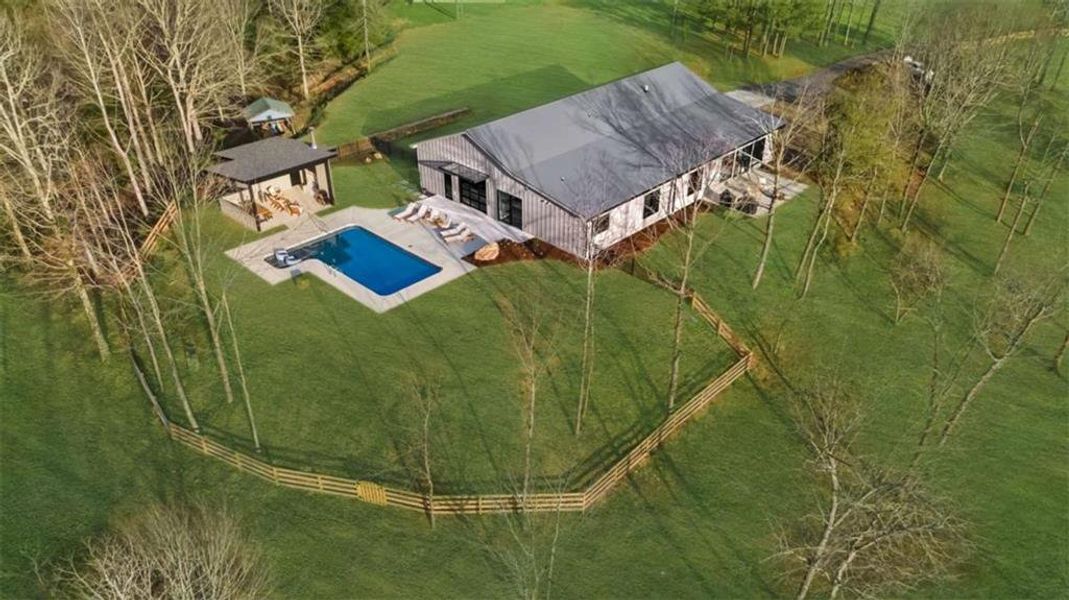 Some properties absolutely take your breath away. This 32-acre estate in the foothills of the North Georgia Mountains is one of them. This pristine farm unfolds like a private park-more reminiscent of a manicured golf course than a traditional farm. Gently rolling pastures, a stocked fishing pond, and over 1,700 feet of flowing creek create an unforgettable landscape. Scattered throughout the property, mature fruit trees, open pasture, and pockets of forest add layers of charm, privacy, and quiet abundance. A serene drive leads you to the heart of the property, where a newly built modern home blends clean architectural lines with warm, natural surroundings. Designed with both intention and ease, the home offers a refined yet highly livable aesthetic-where indoor and outdoor spaces connect effortlessly. A thoughtfully designed split-bedroom layout provides flexibility for multi-generational living or hosting family and friends with ease. Expansive windows flood the home with natural light, bringing the beauty of the outdoors in throughout the day. The kitchen is appointed with high-end, top-tier appliances, offering both function and elevated design. The outdoor living experience is equally compelling, featuring a stunning saltwater pool and a beautifully designed pool house complete with a wood-burning outdoor fireplace-perfect for entertaining or quiet evenings under the North Georgia sky. A separate barn, complete with water and electricity, adds both function and versatility-ideal for equestrian use, hobbies, or future expansion. Private yet conveniently located just one hour from Atlanta and only 10 minutes from Jasper, this is a rare opportunity to own a true legacy property-where land, water, and architecture come together in perfect balance. *This home was completely rebuilt in 2024. Only the best building materials were used in keeping with a top tier luxury design. Home has Nichiha siding - not metal.