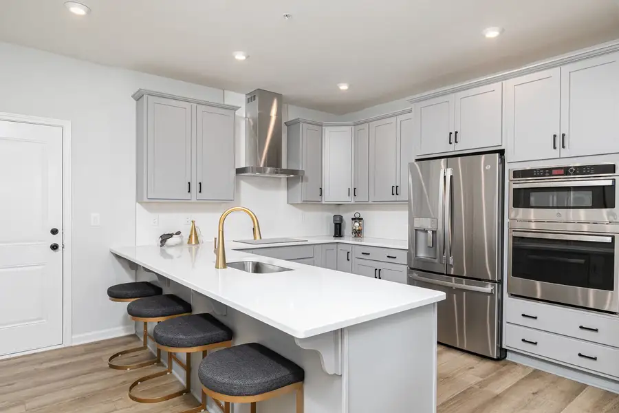 Step inside to discover an open-concept layout that seamlessly connects the chef-inspired kitchen, dining area, and spacious family room, all bathed in natural light. The kitchen is a true highlight, boasting a quartz countertop peninsula that comfortably seats five, perfect for casual meals or entertaining guests. The family room is designed to accommodate a large sectional, creating an inviting space for relaxation and social gatherings.