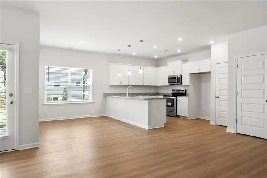 The thoughtfully designed kitchen features granite countertops, upgraded 36" cabinetry, stainless steel appliances, and a convenient peninsula that opens seamlessly to the breakfast nook—ideal for casual dining and gatherings. Just off the family room, step out onto the covered patio, offering a great space for outdoor relaxation and entertaining.
