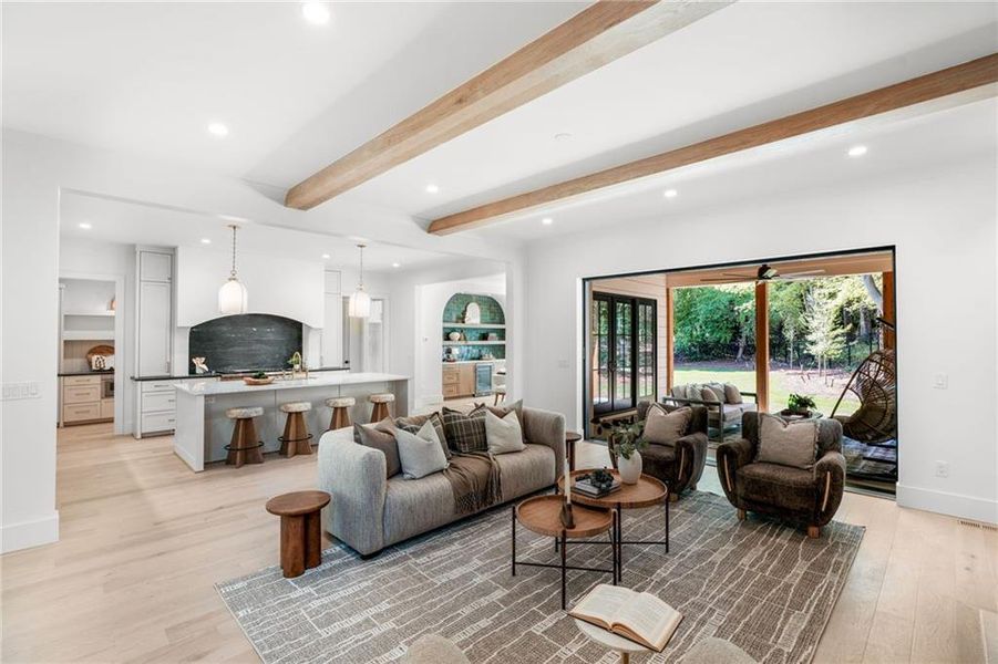 Introducing 44 Hardeman Road. This beautifully constructed new home is serenely situated just above street level offering a flat, walk out from main level backyard on nearly 2/3 acre on a quiet street in highly sought-after Chastain Park. Enjoy city of Sandy Springs services with the convenience the park, all things Buckhead and City Springs area. Welcome guests through the custom iron double front doors featuring a stain grade porch ceiling and 2 story foyer. Open layout designed and finished with today's buyer in mind is set up for entertaining as well as everyday living. Living room with stain grade linear beams, cast fireplace mantle and surround, built-ins with sconce lighting and wide opening access to the covered back porch with fireplace and your massive backyard. The dining room is accented by additional sliding door access to the covered porch creating great flow for entertaining guests, vaulted ceilings and custom bar area. The kitchen has been designed to prep, cook, store and enjoy the space with a large island, custom cabinets and vent hood, customized appliance package with cabinet matching panels and walk thru scullery with pantry storage, 2nd dishwasher and easy flow into the mudroom, 3 car garage and backyard! The main level also offers a full guest suite with walk-in shower and a separate study with 12 foot ceilings. Upstairs, the owner's suite is in the back of the home overlooking the backyard with vaulted and beamed ceilings, large walk-in closet with fully customized closet system and a gorgeous bathroom with dual vanities, freestanding tub and zero entry shower with hand held sprayer and rain head. 3 other bedrooms upstairs are also en suite. The terrace level is fully finished and ready to enjoy with open entertainment room, game room and flex room spaces, separate home gym space, a full bed/bath suite and additional storage. 3 sided brick, Pella windows, detailed trim work, iron railings and more. With so many attractive features and spaces, this home is a must see property.