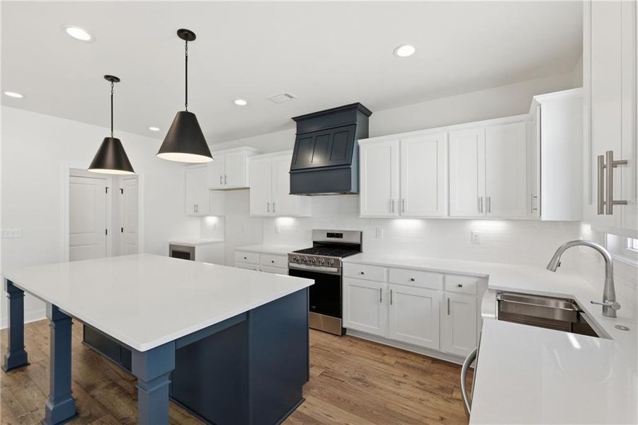 The gourmet kitchen is a true centerpiece, complete with an oversized island, quartz countertops, white and navy cabinetry with nickel hardware, and a stainless steel gas range with a custom hood.