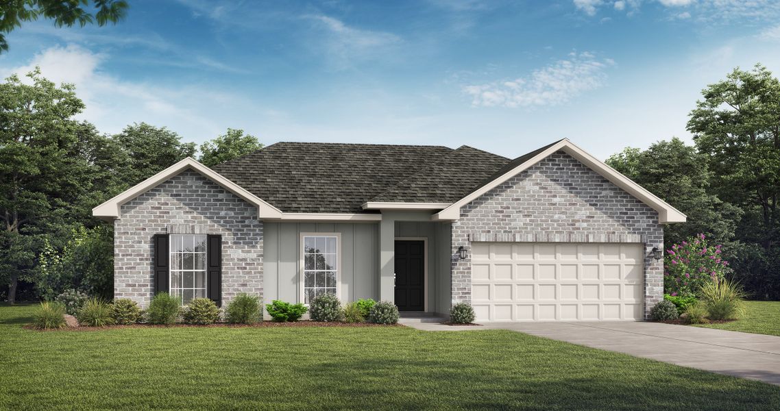 This Stafford located in the peaceful countryside of Doctor's Creek is loaded with curb appeal and always catches the eye- boasting a BRICK FRONT with low-maintenance vinyl accents. It also offers plenty of storage and flexibility, making it ideal for any sized family. The open-concept plan features clear sight lines from both the kitchen and breakfast area- the bright paint and shaker cabinets in the kitchen and bathrooms provide a fresh fresh and modern design. The primary suite has a huge walk-in closet, plus a private bath with garden tub, and separate shower. Artistic renderings are for informational purposes only. Actual floor plans, features, and inclusions may vary.