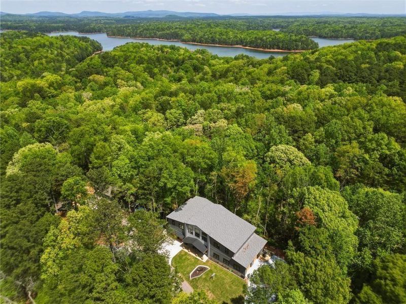 Spanning over 4500+ square feet, the home is thoughtfully designed for the way you live. Dramatic two-story ceilings and expansive walls of windows flood the main living spaces with natural light, creating a sense of scale and openness. An open mezzanine overlooks the living room below, adding architectural interest and flexible additional space. At the center, the chef’s kitchen anchors the home with an oversized leathered quartz island and a beautifully appointed butler’s scullery — ideal for both elevated entertaining and everyday ease. Guests enjoy a main level bedroom w/ensuite bath. The primary suite is privately positioned upstairs, offering its own covered deck and serene wooded views — a true retreat designed for quiet mornings and relaxed evenings away from the main living areas. An additional 3 bedrooms each with en-suite bath completes the ease of living. A defining feature of the property is the approximately 2,700-square-foot heated garage in addition to the standard two-car garage — accommodating 8–10 vehicles in stackable configuration. An exceptional opportunity for collectors, automotive enthusiasts, boat owners, or those seeking expansive hobby space. An expansive rear deck spans the length of the home, creating seamless indoor-outdoor living and a peaceful backdrop after days spent on the lake or trails. With convenient access to I-75 and nearby LakePoint Sports Complex, this residence offers modern luxury with a true lake lifestyle. Modern luxury. Natural privacy. Designed for the way you live.