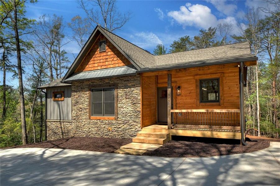 RARE FIND in Buckhorn Estates - Brand NEW construction on a LEVEL, usable 0.74-acre lot with a backyard you can actually enjoy! This spacious mountain retreat stands out from the crowd with larger-than-average living spaces and thoughtful design throughout. The heart of the home is an oversized gourmet kitchen featuring a large island, granite countertops, abundant cabinetry, and rare, dedicated dining space not often found in mountain homes. The great room impresses with vaulted ceilings, stunning blue-buggy wood walls, and a wood-burning fireplace with gas starter, creating the perfect cozy yet elevated mountain feel. Step outside to a large covered porch with gas log fireplace plus an open grilling deck, ideal for entertaining year-round. The main level offers two bedrooms, including a beautiful primary suite with vaulted blue-buggy wood ceiling, walk-in closet, and tile shower. The laundry is also conveniently located on the main floor making this a perfect home for those desiring one level living. The terrace level delivers a whole second living experience with a huge recreation room, gas log fireplace, wet bar with wine rack and glass-front cabinetry, abundant storage, and a private guest suite with full bath. Located in desirable Buckhorn Estates, perfectly positioned between Ellijay and Blue Ridge, this home offers all paved access, circle driveway, high-speed internet, and low HOA fees of just $225/year. Enjoy access to Whitepath Golf Course, a county river park, and fishing lake—plus you’re just minutes from Roo Vineyards. No short-term rentals allowed, making this an ideal full-time residence or peaceful mountain getaway. You seriously must see the interior of this home, it's much larger than it appears!