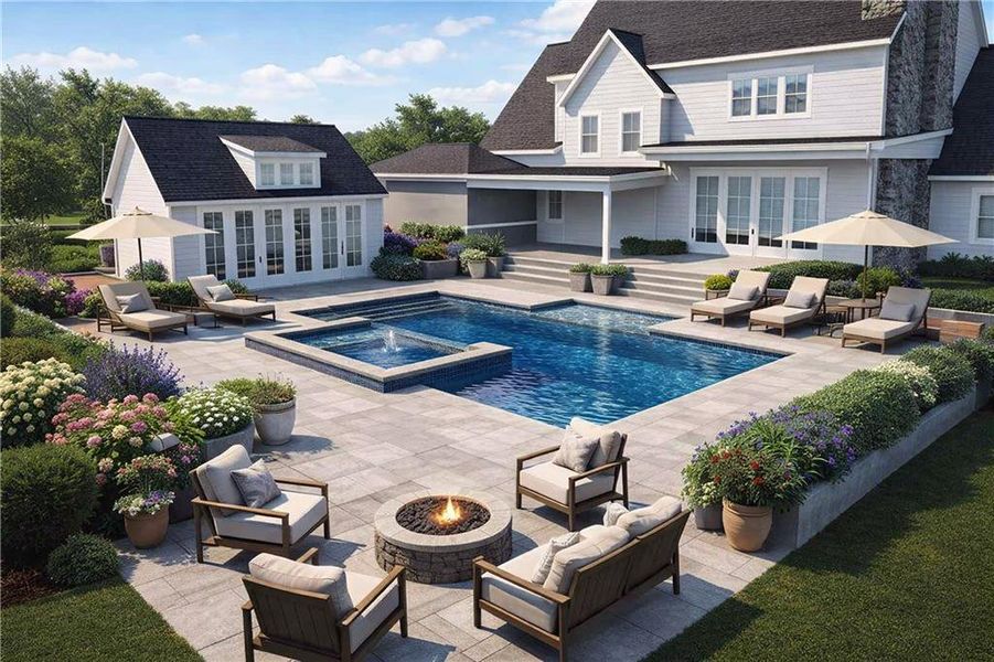 - Cul-de-sacBasementBarPoolSpaOutdoor FireplaceBackyardSoaking TubLandscapingIrrigationPatioFireplaceYardPorch