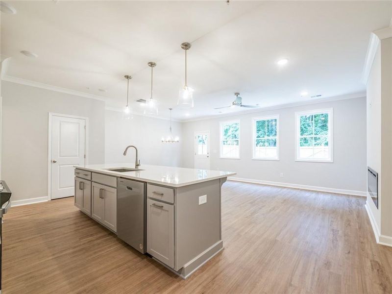 Brooks H – Stylish design, standout finishes, and a location that can’t be beat! Welcome to River Walk Place, a brand-new community just minutes from downtown Lawrenceville. This thoughtfully designed 3-bedroom, 2.5-bath home offers an open-concept layout perfect for both everyday living and entertaining. The chef-inspired kitchen serves as the heart of the home, featuring QUARTZ countertops, Whirlpool stainless steel appliances, white cabinetry, tile backsplash, gas range, and an oversized island overlooking the bright and inviting family room while crown molding adds a refined touch, and durable LVP flooring flows throughout the main level, stairs, and loft. Upstairs, the spacious primary suite provides a private retreat with a double vanity and frameless shower. Two generously sized secondary bedrooms share a well-appointed bath, and the versatile loft offers flexible space for a home office, media room, or play area. Laundry room conveniently located upstairs.