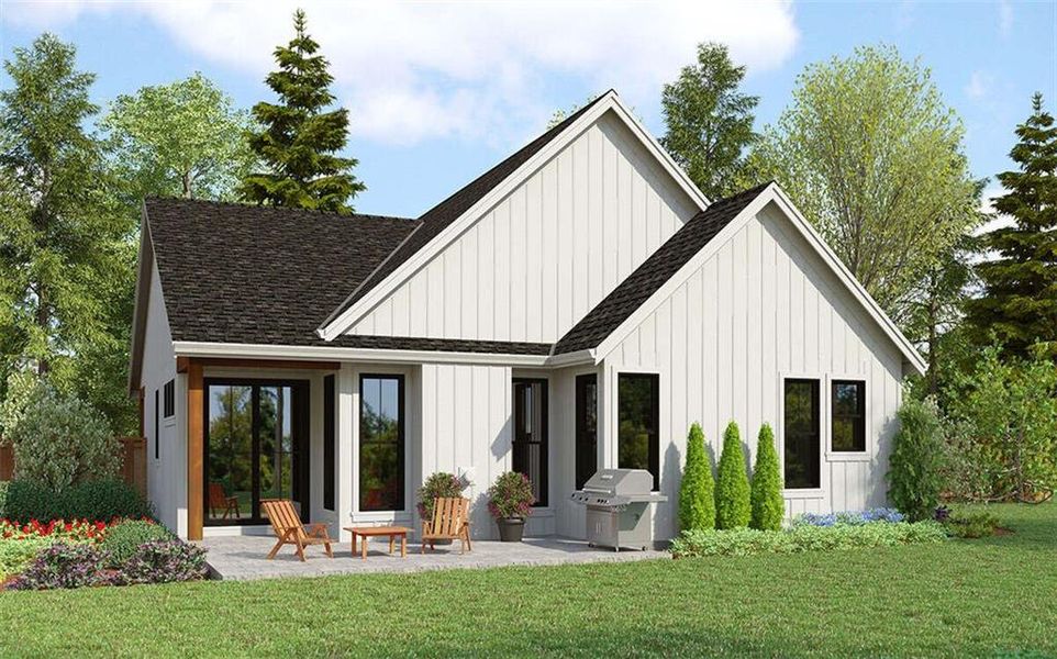 Enjoy outdoor living with a covered patio overlooking a large backyard, perfect for relaxing or entertaining.