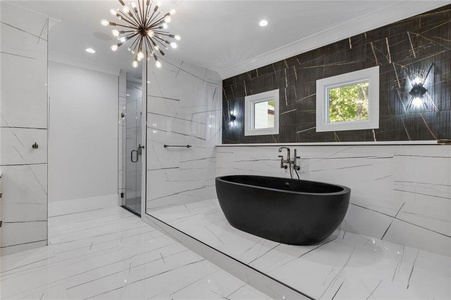 features dual vanities, separate his-and-her water closets, a soaking freestanding tub, and an oversized shower with body jets.
