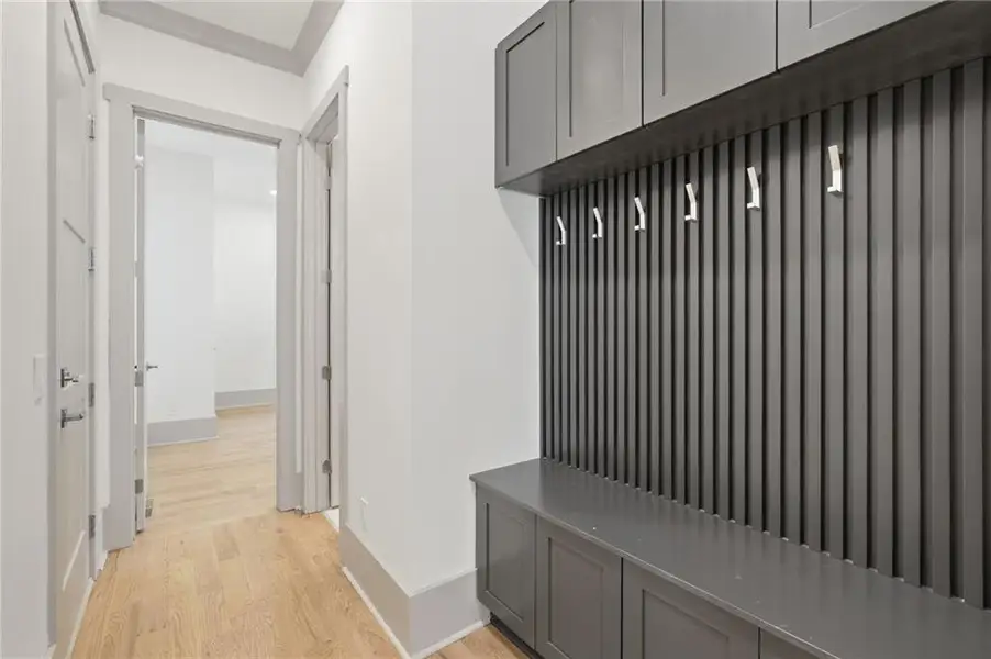 The chef’s kitchen features custom double-stacked cabinetry with glass doors on the top, an oversized 5’ x 11’ island ideal for entertaining, and a walk-in pantry with extended countertops for small appliances. High-end appliances, including a built-in refrigerator, will be installed soon. Upgraded Calacatta quartz countertops are featured throughout the home.