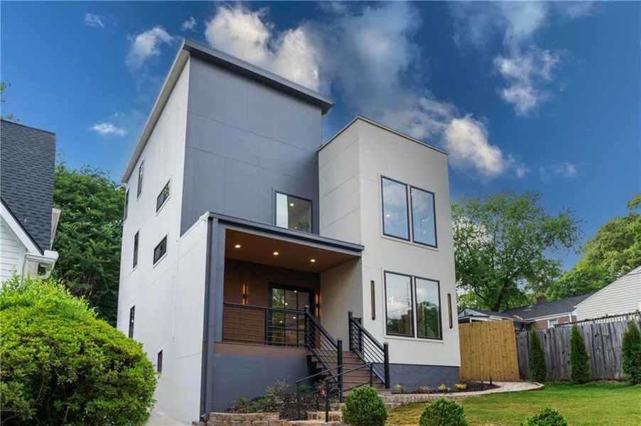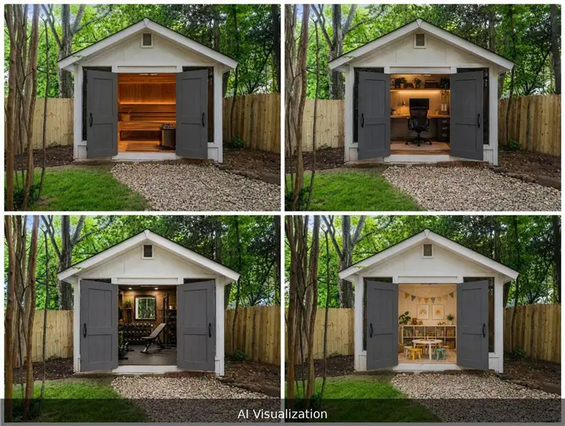 Steel and glass doors lead to a professionally landscaped, private flat rear yard framed by towering crape myrtle trees. Designed for both everyday living and entertaining, the outdoor spaces include a massive deck, fire pit, landscape lighting and a large detached structure currently used for storage but equally suited as an artist’s studio, playhouse, or other flexible bonus space.