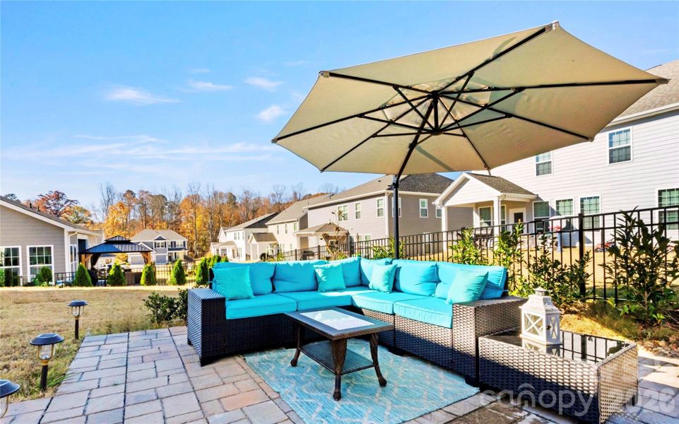 Over $30,000 has been invested in custom stonework, including an extended covered patio, a stone pathway, and a separate lounge area. The fully fenced yard, framed by evergreen plantings, creates privacy and a finished outdoor living experience that new construction typically does not include.