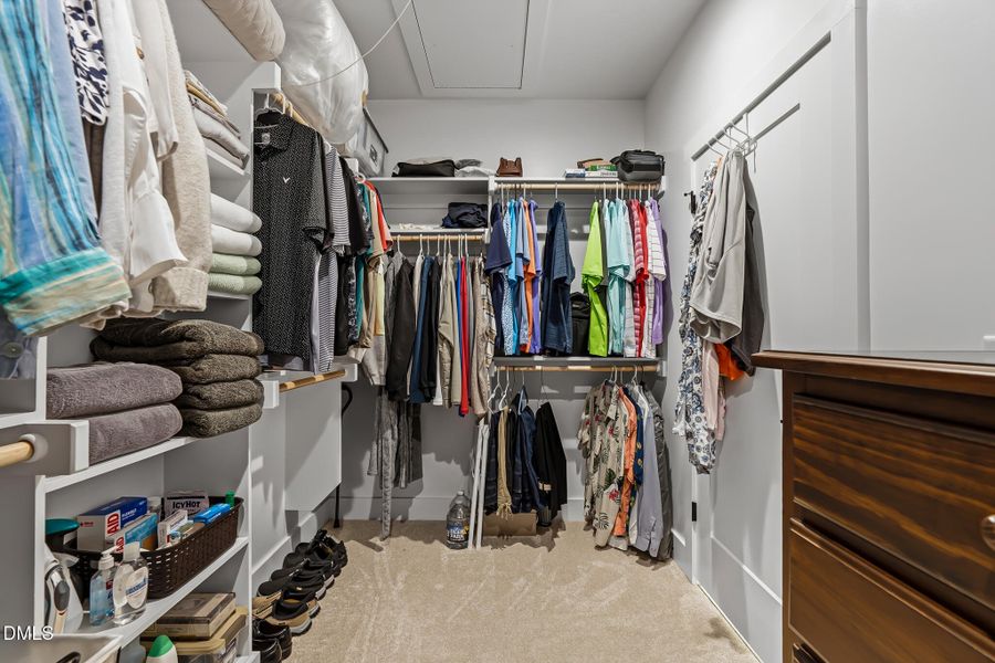 - Ceiling-HighWalk-In ClosetCrown MoldingPantryBuilt-in BookshelvesSliding DoorsSeparate Shower