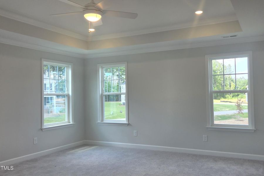Upstairs, the primary suite includes a tray ceiling, plush carpet, and an expansive walk-in closet. The luxurious primary bath boasts a freestanding soaking tub, tiled walk-in shower, dual vanities with quartz counters, tile flooring, and a linen closet.