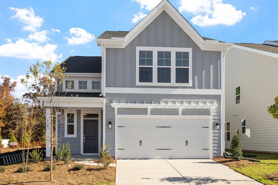 The home is designed with you in mind! At the heart of the home is a stunning gourmet kitchen featuring a GE gas cooktop, upgraded appliances, and an expansive island—perfect for entertaining or everyday meals. The layout includes ample cabinet space, including extra storage above the washer and dryer in the nearby laundry room. Luxury vinyl plank flooring extends throughout the entire first floor and second-floor hallway, offering both style and durability. Hardwood stairs with sleek metal rails lead you to the upper level, while increased baseboards add a touch of elegance throughout. A comfortable first-floor guest suite includes a full bath with a tiled shower, and an additional powder room provides added convenience for visitors. The spacious covered porch offers a relaxing outdoor escape, ideal for morning coffee or evening chats. Upstairs, the primary suite features a boxed ceiling and a beautifully tiled shower in the en-suite bath. Secondary bedrooms are carpeted for comfort, creating a cozy retreat for loved ones and guests. Every detail has been thoughtfully chosen to make this house feel like home, the kind of place where meals are shared, memories are made, and comfort is always within reach.