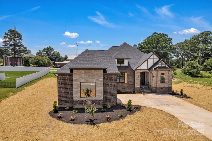 Stunning new construction brick home with stone accents on over 1 acre, offering 3 bedrooms, 3 bathrooms, and luxurious custom finishes throughout. The spacious living room features a coffered ceiling, electric fireplace flanked by built-ins, and flows into the kitchen with quartz countertops, gas range with pot filler, custom hood, microwave, dishwasher, wine fridge, large eat-in island and a massive walk-in pantry. The elegant primary suite boasts a spa-like bath with dual vanity, seamless glass double shower, soaker tub, and walk-in closet. One guest bedroom has a private bath, while the other has direct access to a full bath. Additional highlights include a formal dining room, laundry room with sink, drop zone, and 2-car garage. Enjoy outdoor living on the covered porch with gas fireplace, stepping down to a custom paver patio area with fire pit. All this conveniently located just minutes from I-85 & US Hwy-74!