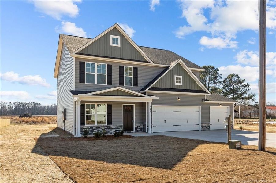 Discover the perfect blend of modern design and country charm in this stunning 4-BR, 2.5-bath home, situated on a spacious 1/2 ac lot. Enjoy cozy evenings by the electric fireplace in the great room. Kitchen boasts SS appliances, white cabinetry, a farmhouse sink, granite countertops, pantry, and a charming breakfast nook, catering to both style and functionality. Need a formal dining room, playroom, or home office, this residence offers flexible space to suit your needs. 1st floor with LVP flooring. All bedrooms are located upstairs, along w/ laundry room for added convenience. Spacious primary suite features dual walk-in closets, while the en-suite bathroom offers separate vanities, garden tub, and separate shower. No HOA. No city taxes. Tranquil country setting just minutes away from city conveniences, offering the best of both worlds. Christy Strickland w/Atlantic Bay Mortgage (910-574-2105) is the preferred lender and will offer additional incentive of up to 1% of loan amount in addition to Builders $10,000 Use as you choose incentive. Blinds are installed on operable windows. The listing agent is related to the builder.