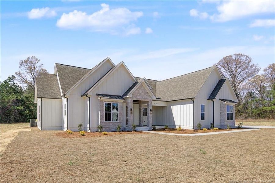 Welcome to your dream home! Nestled on 1.49 acres in an exclusive new executive subdivision of just eight homes, this beautifully crafted custom-built modern farmhouse ranch offers a peaceful retreat surrounded by mature trees and natural beauty. Located across from Grays Creek Airport, this home delivers the best of both worlds—serene rural living with convenient access to Hwy 87, shopping, schools, and Fort Bragg. Designed with thoughtful detail and timeless appeal, this residence features four bedrooms, three and a half bathrooms, and stunning color drenched office/library/flex space, combining comfort, style, and functionality. Abundant natural light fills the home through oversized windows, accentuating the modern finishes, open layout, and exceptional craftsmanship throughout. The gourmet kitchen is a culinary delight, showcasing custom cabinetry, a spacious quartz-topped island, and ample storage, perfect for everyday living and entertaining alike. The gracious living area boasts vaulted ceilings and a seamless flow to the covered back porch, where a cozy fireplace and entertainment outlets create the ideal setting for gatherings or quiet evenings outdoors. Experience the perfect balance of luxury and livability in this remarkable home where every detail reflects quality, comfort, and Carolina charm. A 1% lender credit on the loan amount is available when using the preferred lender, Christy Strickland with Atlantic Bay Mortgage (910-574-2105).