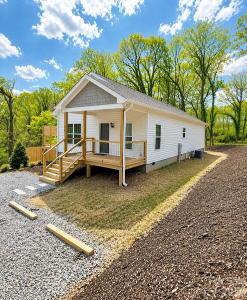 Tucked away on a private lot in the growing Candler area just minutes from Asheville, this single-level new construction home offers the perfect blend of comfort, style, and low-maintenance living. Designed with an open, airy layout and filled with natural light, the home feels calm, welcoming, and easy to live in. The kitchen features granite countertops, a farmhouse sink, and a seamless flow into the main living space—ideal for everyday living or gathering with friends and family. The spacious primary suite includes a large bedroom, generous closets, and a beautifully tiled walk-in shower. Enjoy the convenience of one-level living with durable, modern finishes and blinds throughout. Step outside to a private deck overlooking a peaceful wooded setting—perfect for relaxing after a long day. A rare opportunity to enjoy new construction, privacy, and convenience at an attainable price.