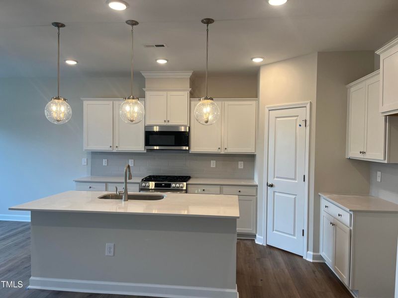 - Range-Free StandingDishwasherMicrowave OvenDisposalGas CooktopQuartz countertopKitchen IslandGas Oven