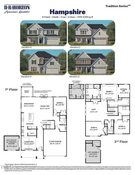 Welcome to the Hampshire, one of our two-story plans featured at Manors at Winston Pointe in Clayton, NC, offering 6 modern elevations. The home features 4-5 bedrooms, 3-4 bathrooms, 3,113-3,130 sq. ft. of living space, and a 2-car garage.
