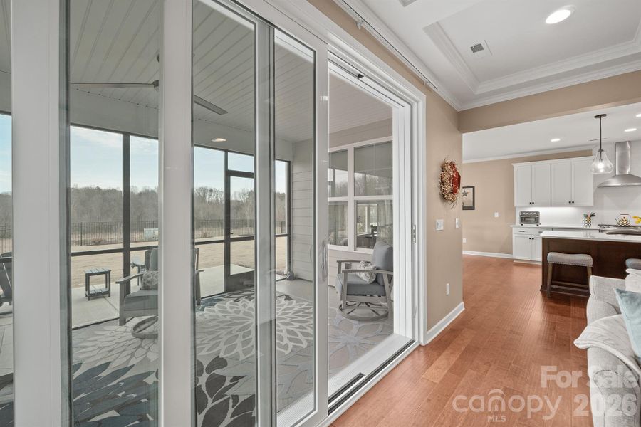 Experience elevated living in this beautifully upgraded 4 bedroom, 4 bathroom home featuring an open concept design and refined finishes throughout. Hardwood floors and fresh paint set an elegant tone from the moment you enter. The spacious living room impresses with a coffered ceiling, gas fireplace, and sweeping views of the premium lot, backing to a serene stream and wooded landscape. The living area flows seamlessly into the gourmet kitchen, complete with a large island, stainless steel appliances, quartz countertops, and a farmhouse sink. A generous dining area, also overlooking the backyard, creates the perfect setting for everyday living and entertaining. The main level offers a luxurious primary suite with a spa inspired bathroom, an additional office/flex room, and a private guest bedroom with a full bath. Upstairs, a large recreation room anchors the space, accompanied by two additional bedrooms, two full bathrooms, and abundant storage. Outdoor living shines with a screened in porch and extended patio overlooking the fully fenced backyard, enhanced with upgraded landscaping and tranquil natural views; an ideal retreat for relaxation or gatherings. High end touches such as custom drapery, motorized shades, and a thoughtful, flowing layout elevate both comfort and style. The home also includes the added benefit of a remaining builder warranty and termite bond for peace of mind. Conveniently located near shopping, dining, and easy access to Hwy 85 and Hwy 485, this home blends luxury, comfort, and convenience in every detail.