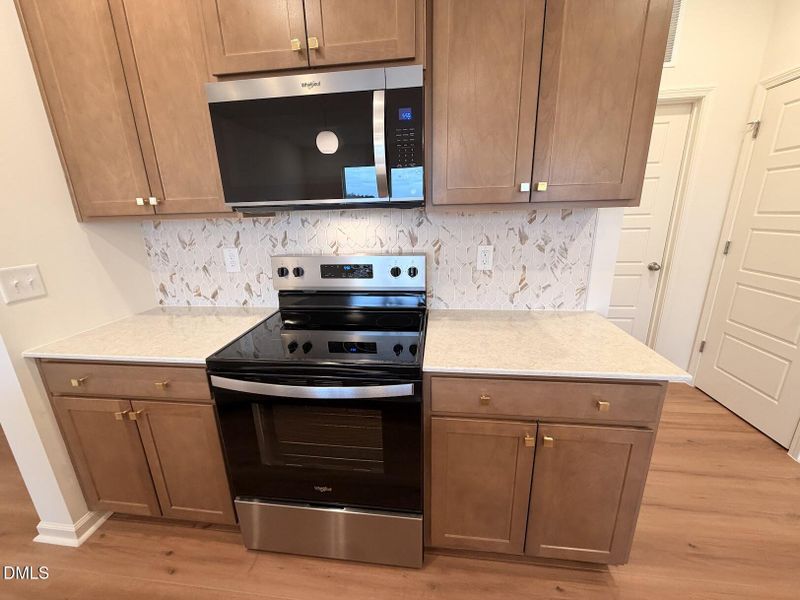 Spacious and light-filled, this 4-bedroom, 2.5-bath two-story townhome with a two-car garage offers modern style and comfort throughout. The open floor plan features 9-foot ceilings and a stunning kitchen with a large island, quartz countertops, luxury vinyl plank flooring, Whirlpool® stainless steel appliances, Aristokraft cabinetry, and Moen fixtures. The generous owner's suite includes a dual-sink vanity, walk-in shower, elongated toilet, and Moen faucets.