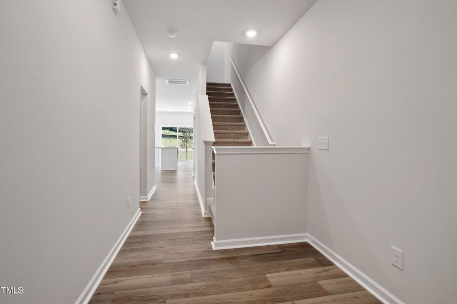 Welcome to this beautifully designed 2-story townhome, offering 3 bedrooms, 2.5 baths, and a thoughtfully planned main level. The first floor features 9-ft ceilings and luxury vinyl flooring throughout, with a bright white kitchen that includes a spacious sink, flowing seamlessly into the open living area. A private patio provides a peaceful outdoor retreat, perfect for enjoying the fresh air. The attached garage entry adds convenience to your daily routine.