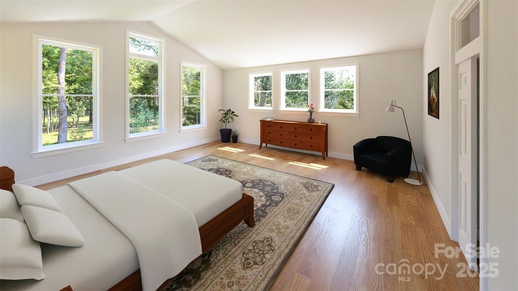 The upper-level suite is designed as a coveted owner’s retreat—private, expansive, and truly set apart. At the stair landing, a barn-door niche allows for a second washer/dryer. Dual custom closets line one side, while the spa-like bath with marbleized tile, vaulted walk-in shower, and double vanity anchors the other. The 400-sf primary bedroom is vaulted and wrapped in windows capturing magnificent southern mountain views.